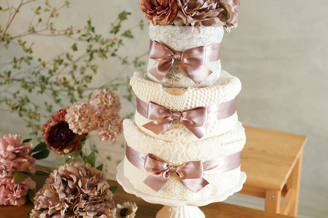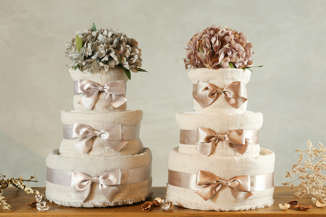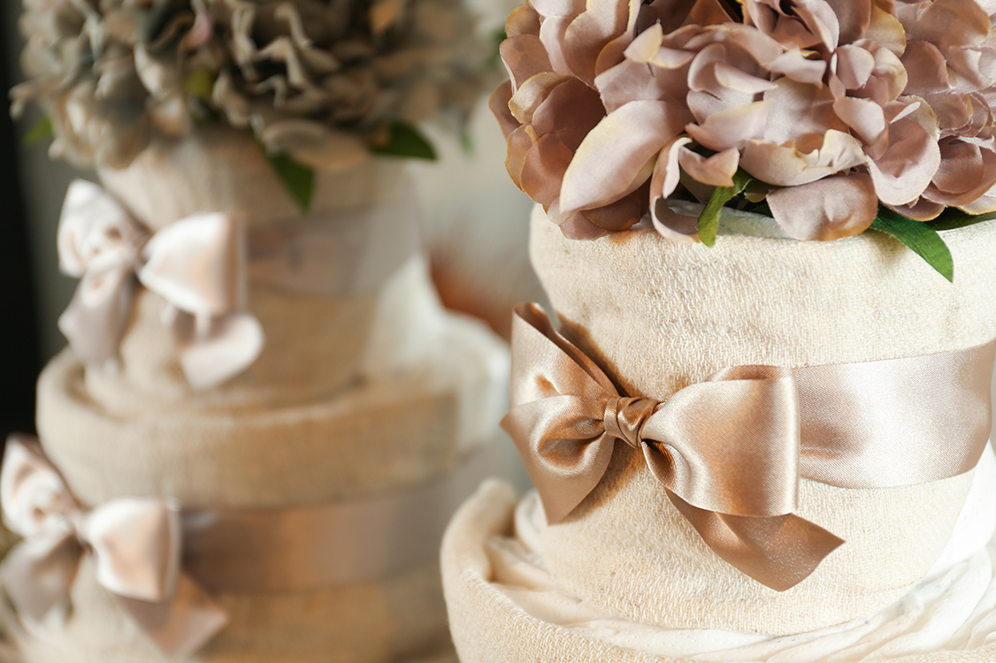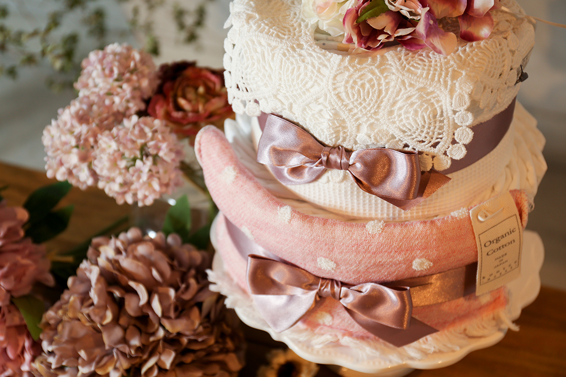 おむつケーキ アメリカでは、ベビーを迎える前に“ベビーシャワー”というパーテイーを開く習慣があります。家族や友人と集まって、出産前祝いするのです。そこでマタニティママにプレゼントとして渡されるのが、おむつでつくったかわいいケーキ「おむつケーキ」。産まれてくるベビーが喜ぶグッズなどが飾り付けられています